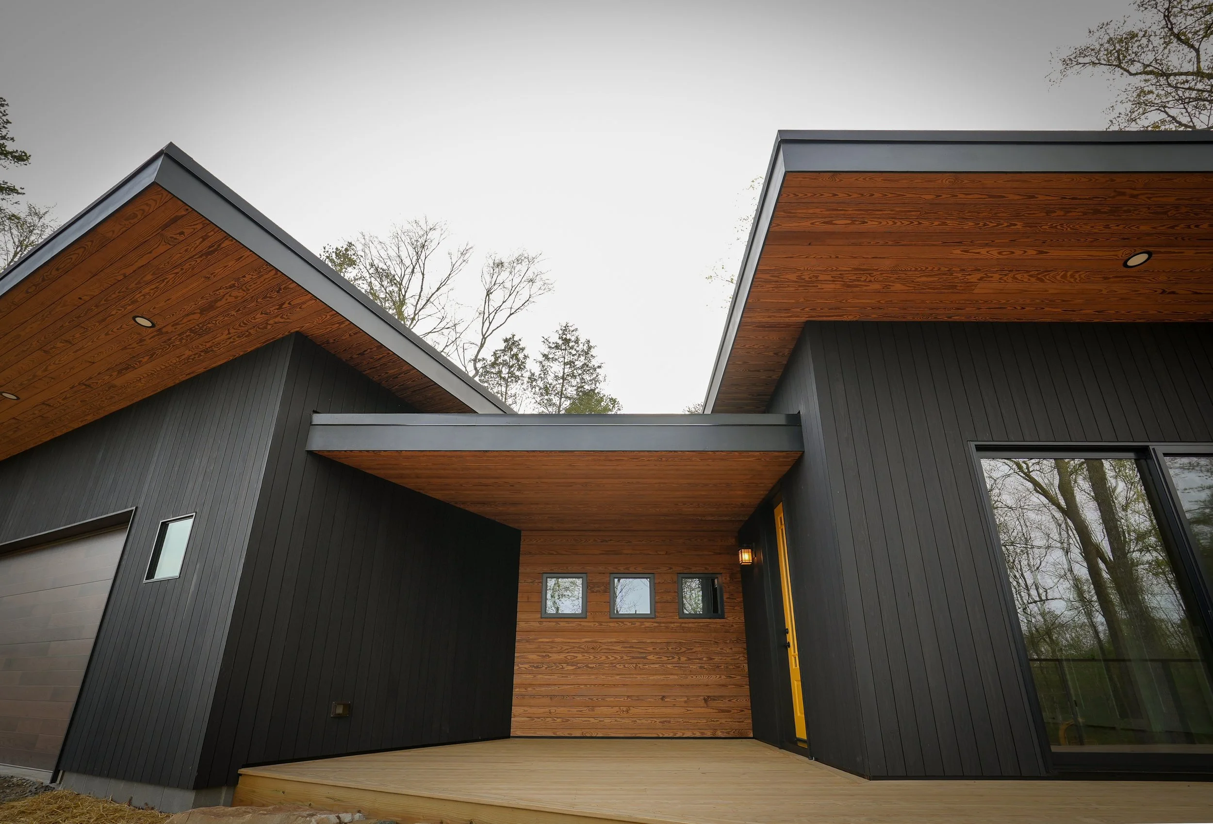 Custom designed and built for a young family, this small scale dwelling sits on a 15 acre sustainable agroforestry farm on the outskirts of Mocksville, North Carolina. Nestled on the edge of a ravine that funnels water into Hunting Creek and on the edge of the 100 year flood plane, the home sits atop concrete piers and glulam beams to eliminate moisture and water issues often associated with crawl space type foundations. Extra insulation keeps the home comfortable and energy efficient. The home is clad in Arbor Wood Co. chemical free, sustainable, heat and steam treated pine stained natural and black. Weather Shield VUE series all aluminum windows and doors and Cable Bullet railing on the front deck add to the modern aesthetic of the home.