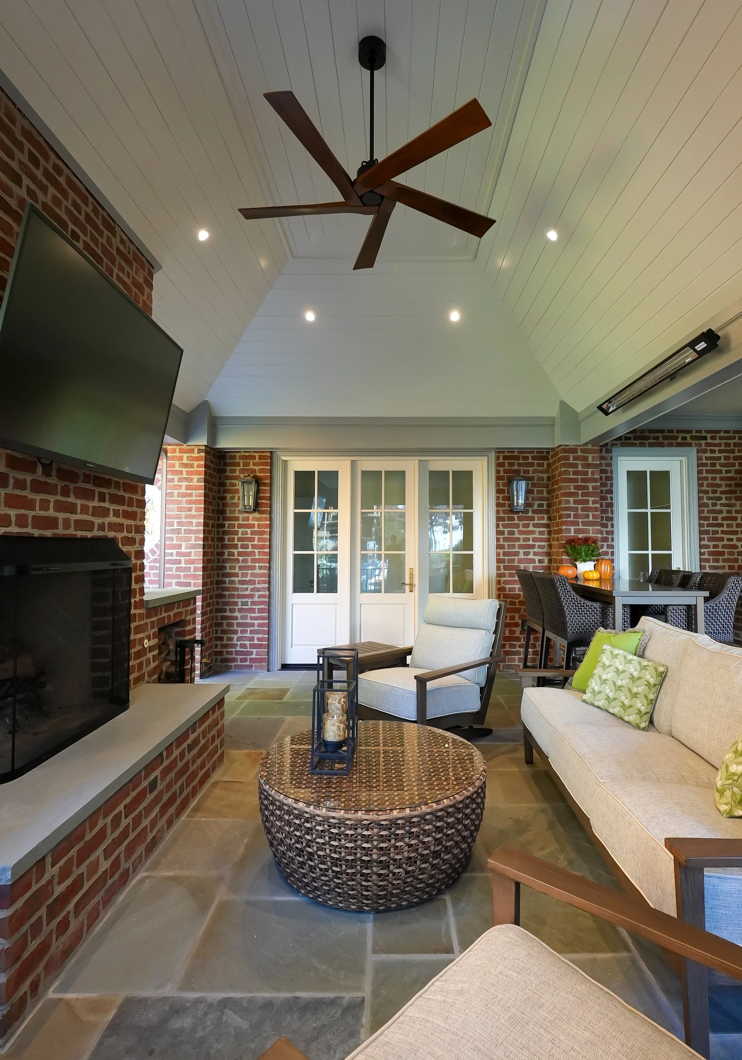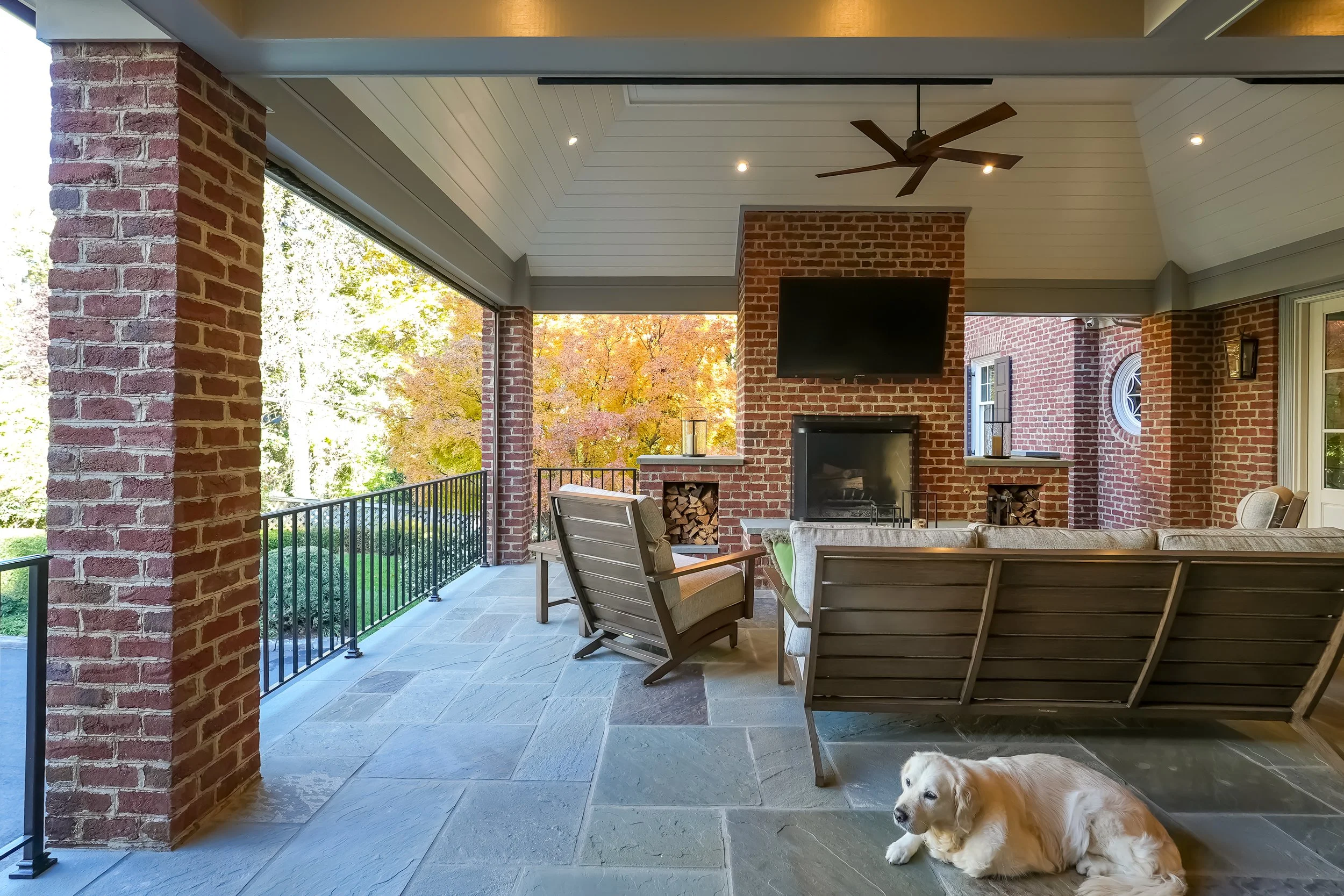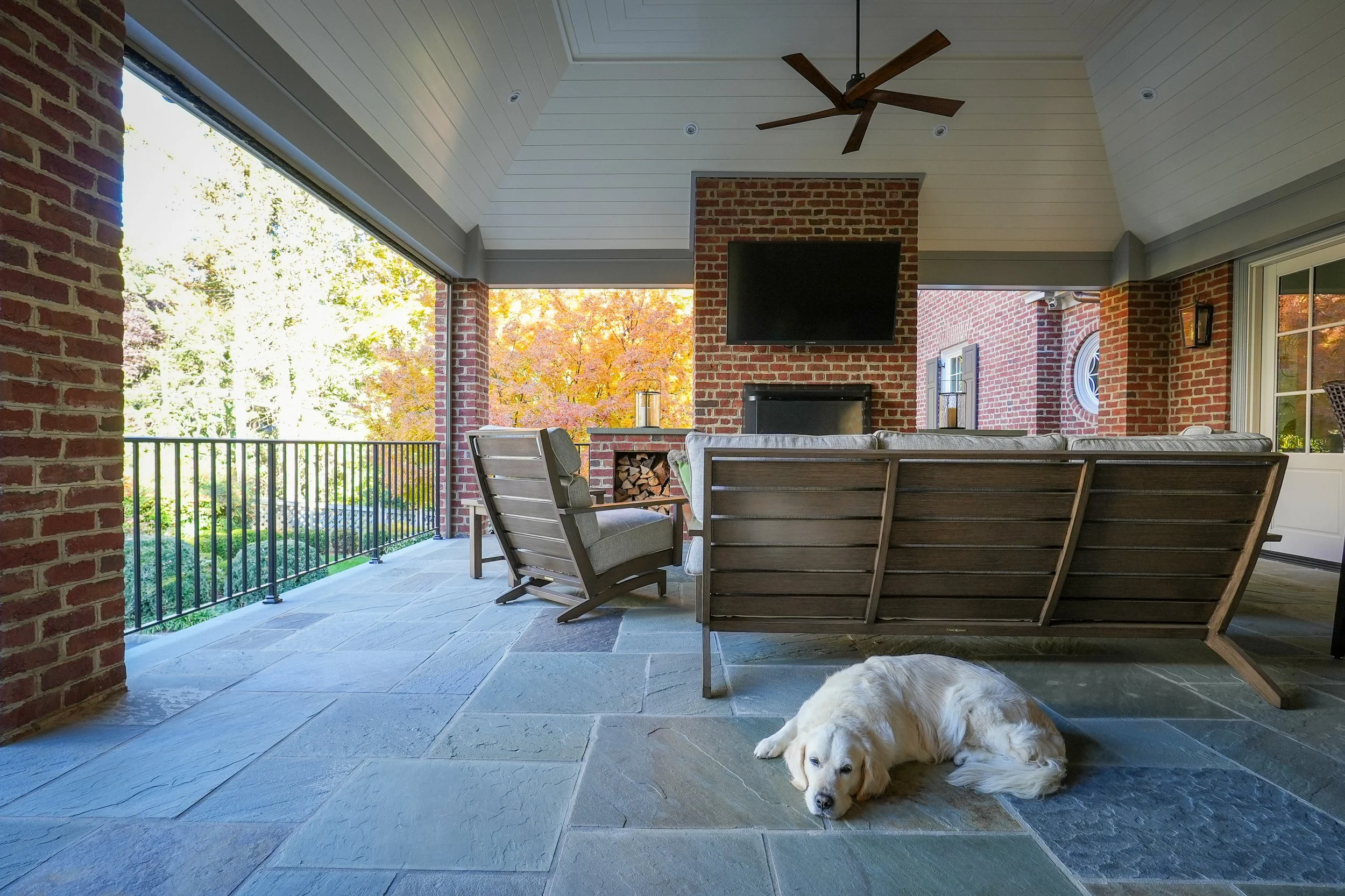 The primary focus was adding an ample outdoor living area for entertaining and relaxing by a wood burning fire place watching the big game or tournament. A gas grill and Big Green Egg under the covered area allow for grilling in any weather. Adjacent to the covered patio is a new primary suite addition giving the owners the ability to live all on the main level. Below the new primary suite and patio are a mudroom, large home office and car port. The kitchen, drop zone and two secondary bathrooms were updated in the process.