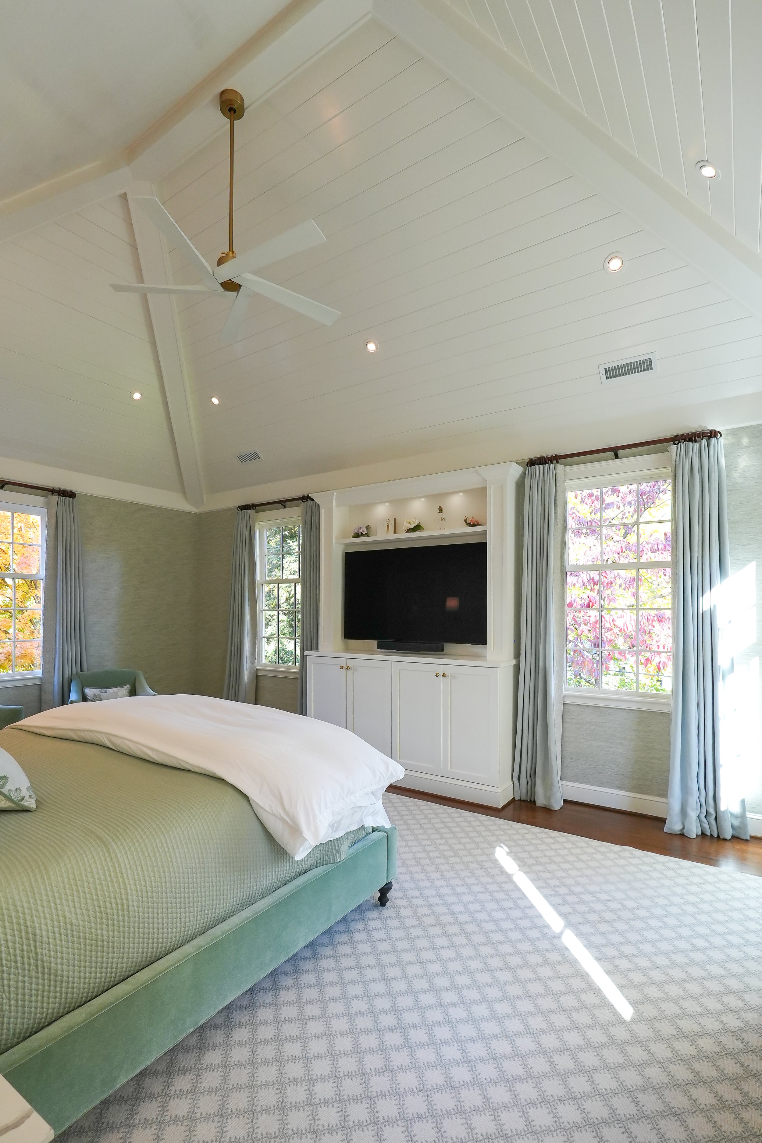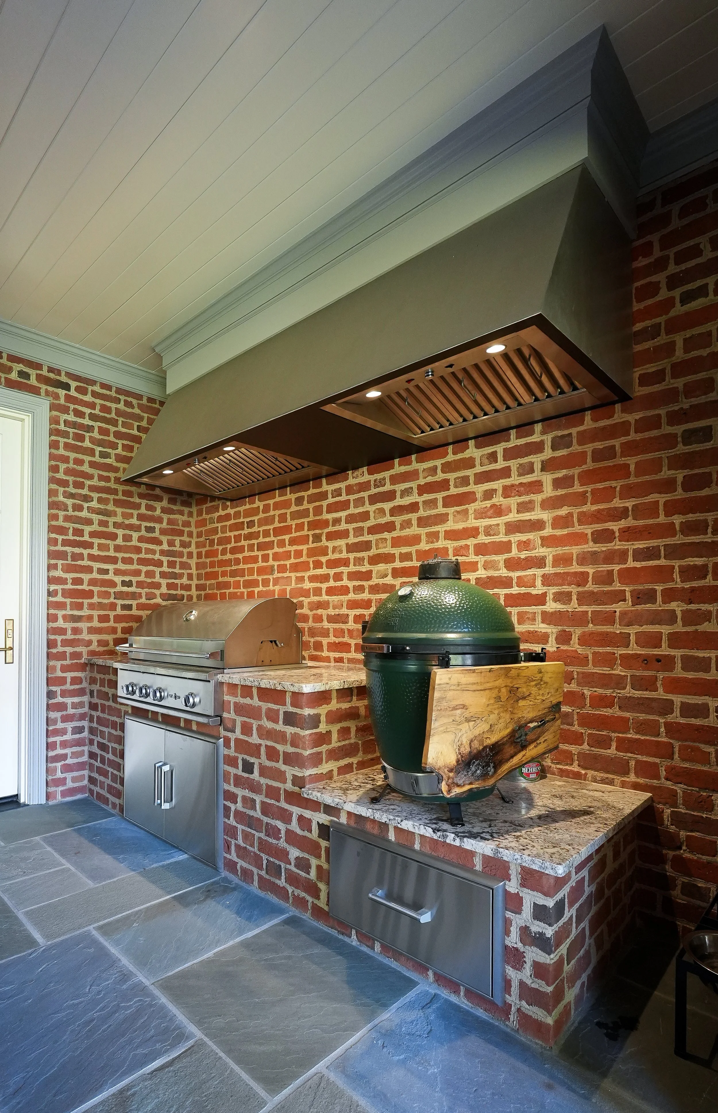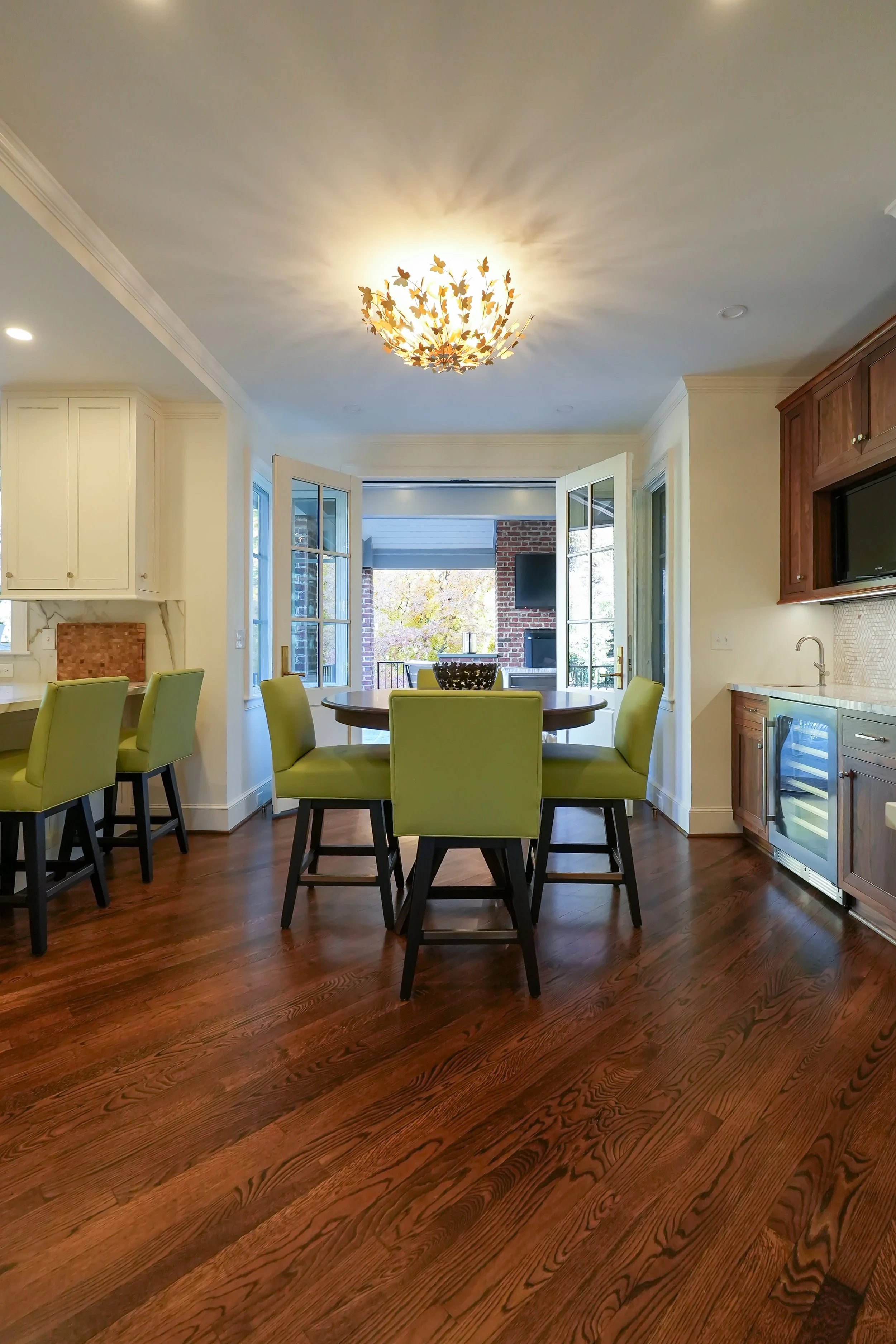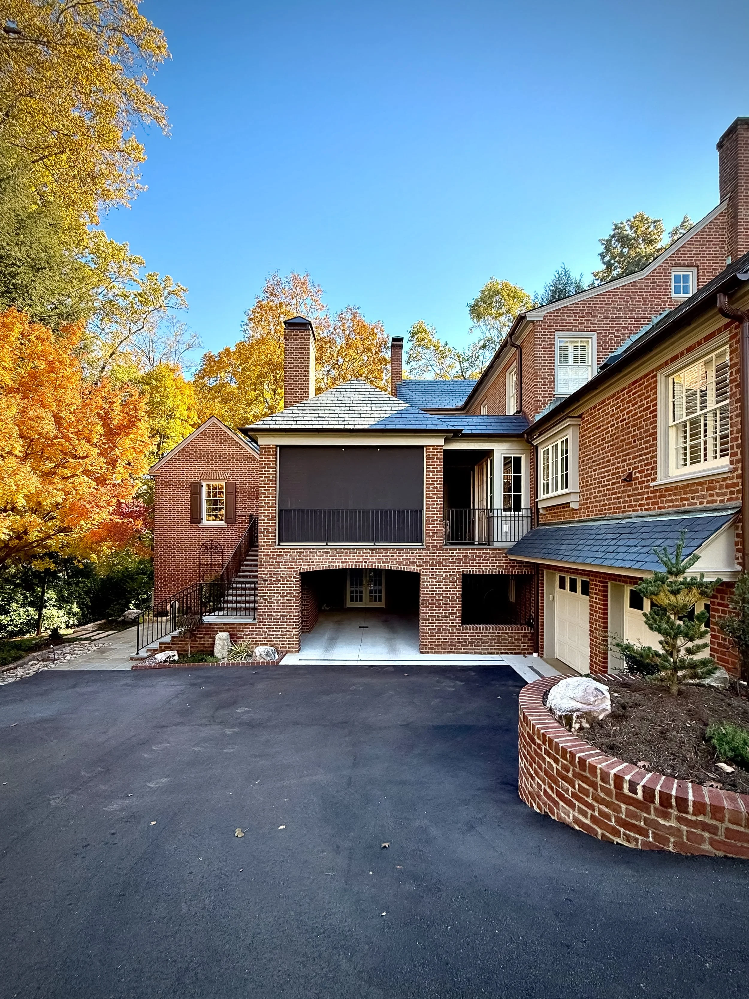 The primary focus was adding an ample outdoor living area for entertaining and relaxing by a wood burning fire place watching the big game or tournament. A gas grill and Big Green Egg under the covered area allow for grilling in any weather. Adjacent to the covered patio is a new primary suite addition giving the owners the ability to live all on the main level. Below the new primary suite and patio are a mudroom, large home office and car port. The kitchen, drop zone and two secondary bathrooms were updated in the process.